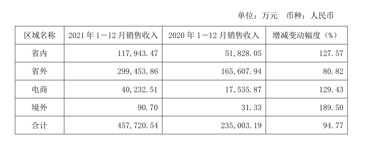 另外,按照消费区域划分,舍得酒业2021年在省内、省外分别实现销售收入11.79亿元、29.95亿元,同比提升127.57%、80.82%。