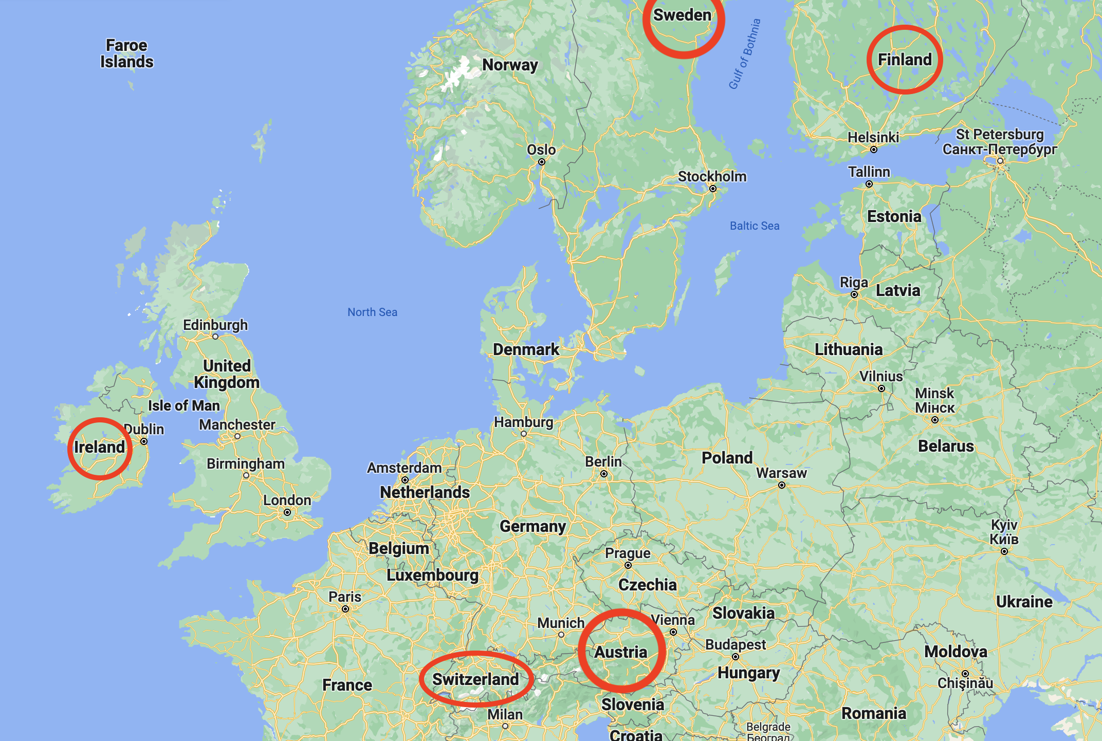 奥地利、瑞典、瑞士、芬兰和爱尔兰是欧洲的中立五国。