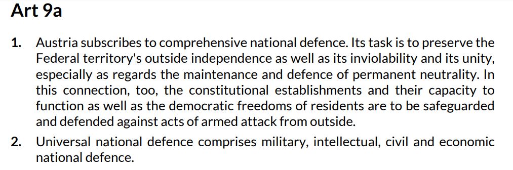 奥地利于1995年加入欧盟,也意味着加入欧盟的共同外交与安全政策。为此,奥地利特意在宪法中加入新条款,确定在欧盟共同外交与安全政策框架下的行动不违反奥地利的中立地位。