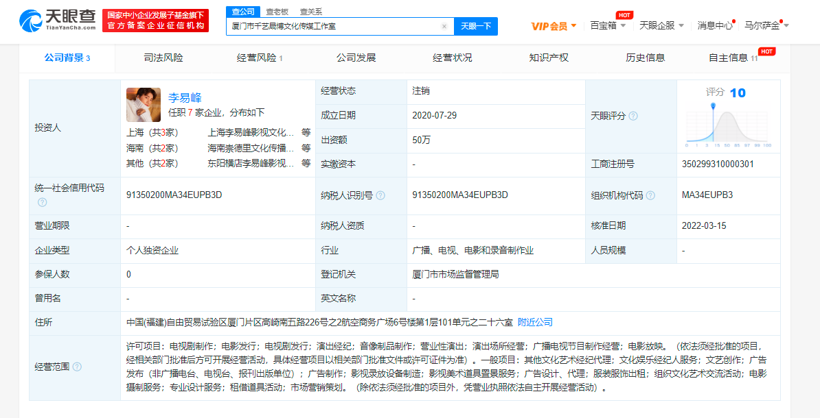 据天眼查App显示,3月15日,厦门市千艺晟博文化传媒工作室被注销,注销原因为决议解散。厦门市千艺晟博文化传媒工作室成立于2020年7月,李易峰为投资人并全资持股,出资额50万,经营范围含电视剧制作、电影发行、演出经纪等。