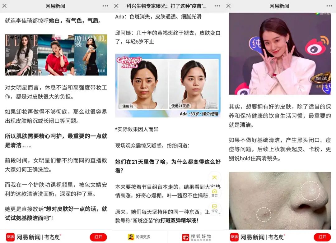 再如,公司旗下公众号“不二大叔”发布的《科兴生物专家曝光:打了这种“疫苗”,女人再也不长斑!》一文,宣传一款名为“打斑双弹精华液”的化妆品,标题与文章内容存在较大出入,极易误导消费者。