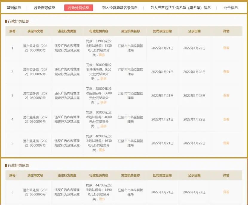 据国家企业信用信息公示系统显示,仅在2022年1月22日一天内,该公司的行政处罚决定就多达6条,罚款共计23.33万元,没收违法所得5.5万元。