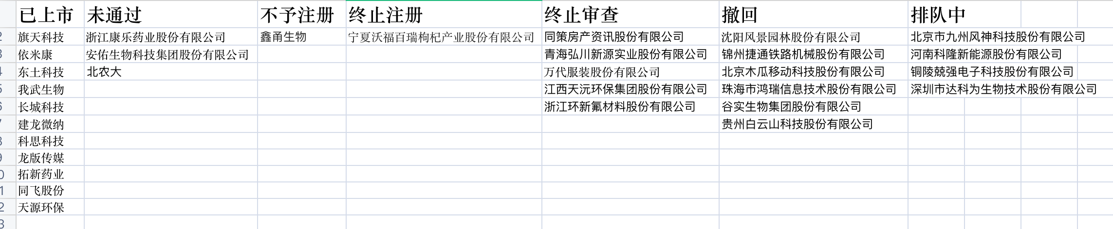 除此外,“终止审查”的公司有同策房产资讯股份有限公司、青海弘川新源实业股份有限公司、万代服装股份有限公司、江西天沅环保集团股份有限公司、浙江环新氟材料股份有限公司,“撤回”的有沈阳风景园林股份有限公司、锦州捷通铁路机械股份有限公司、北京木瓜移动科技股份有限公司、珠海市鸿瑞信息技术股份有限公司、谷实生物集团股份有限公司、贵州白云山科技股份有限公司。