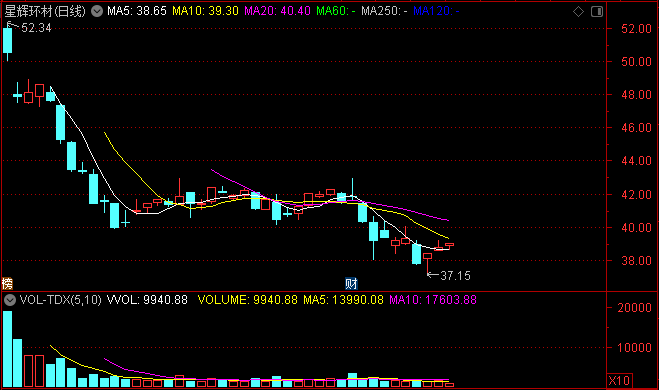 超募的星辉环材股价走势不如人意。股价从未达到发行价,上市首日即破发,最高价也只有52.34元/股。之后一路走跌,最低曾下探至37.15元/股,最新收盘价39.03元/股,总市值76亿元。