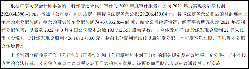 公告显示,星辉环材拟向全体股东每10股派发现金股利22.00元(含税),合计派发现金股利4.26亿元。星辉环材提取法定盈余公积后的利润连同上年末的未分配利润,剩余的可供股东分配利润为4.37亿元。