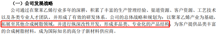 星辉环材发展战略显示,公司战略规划包括,“以聚苯乙烯产业为基础,拓展至其他合成树脂领域,并进行纵深改性开发,形成多品类、专业化的产品结构”。