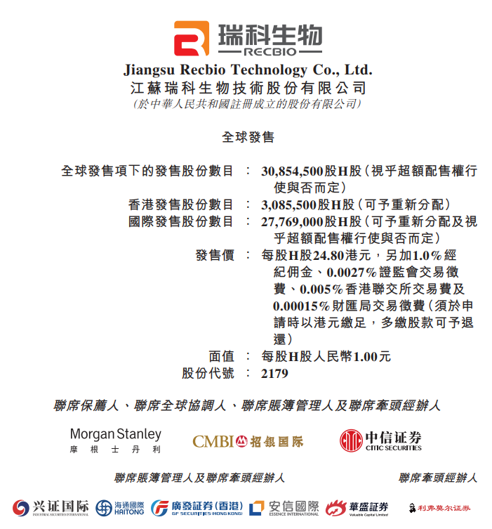 瑞科生物-B于3月21日早间在港交所公告,拟全球发售3085.45万股股份,其中香港发售股份308.55万股,国际发售股份2776.9万股,另有15%超额配股权,发售价为每股24.80港元;2022年3月21日至3月24日招股;摩根士丹利、招银国际及中信证券为联席保荐人;预期股份将于2022年3月31日于联交所主板挂牌上市,H股将以每手500股买卖。