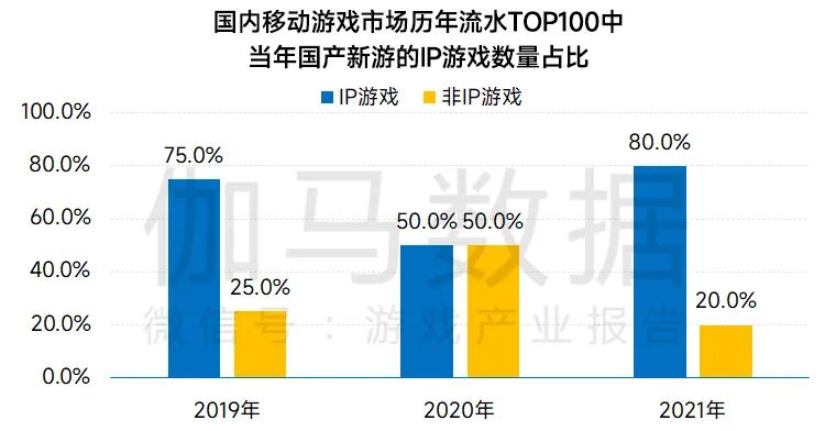 2019年和2021年是IP游戏在移动游戏市场集中爆发的两年。无论是从数量角度还是从流水角度,IP游戏均取得了优秀的商业成绩。2019年入榜流水TOP100的新游中IP作品数量占比达到75%,流水占比达到85.5%;2021年入榜流水TOP100的新游中IP作品数量占比达到80%,流水占比达到76.5%。伽马数据分析,近三年来,中国移动游戏市场的国产新游中虽然不乏非IP头部爆款,但多以《原神》《一念逍遥》《江南百景图》和《最强蜗牛》为代表,从技术上和玩法上在某个细分品类做出创新进而成为该品类游戏的头部产品,具有一定的风险和开发难度,而IP游戏的风险相较于原创游戏要更低。