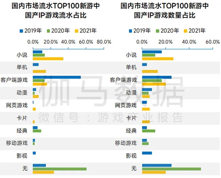 虽然2019年和2021年均是IP游戏的爆发之年,但实际上2019—2021年,移动游戏中的IP游戏产品内部格局已然发生了重大变化。2019年的IP新游多来自已经在PC端被验证过商业模式的客户端游戏,移动游戏的IP改编仍然较为保守,流水较高的IP游戏仍停留在“端改手”阶段。2019年“端改手”的游戏在新游中数量占比为25%,但流水占比高达54%。到了2021年,商业价值较高的客户端游戏IP已经被大量消耗,IP改编的类型更加多元;小说类IP大放异彩,成为新游流水最高的IP类别,流水占比达到34.2%;单机游戏IP也蓬勃发展,取得了优秀的商业成绩。总体来看,IP游戏市场经过三年的发展越来越多元,以小说类和单机游戏类为代表的IP游戏三年来市场份额不断增长,客户端游戏类IP的改编游戏市场份额不断下降,从2019年占比39.3%下降到2021年占比32.0%。