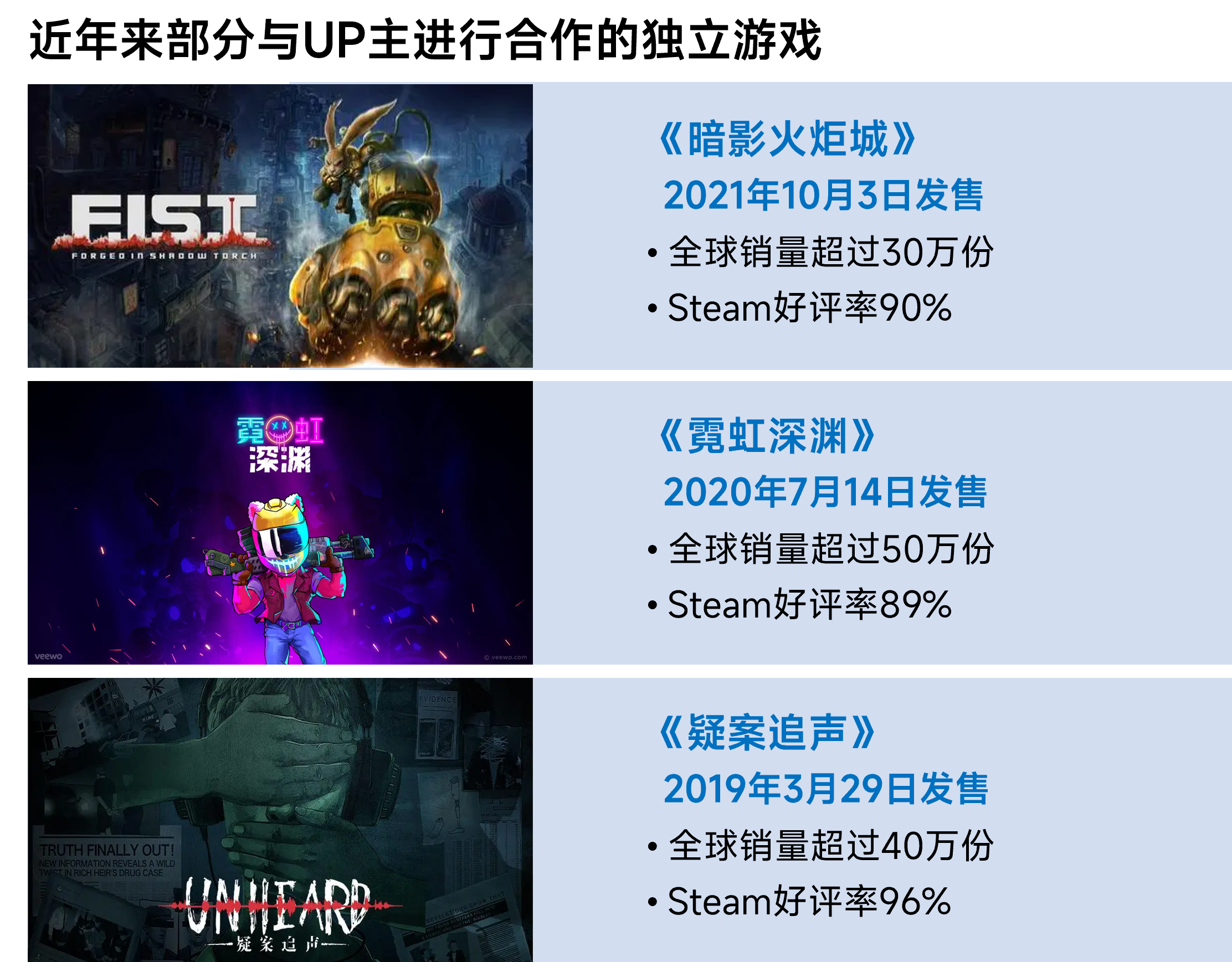 此外,直播平台和UP主丰富的UGC内容也给独立游戏宣发提供了更多维度,探索出了与移动游戏不同的宣发策略。从《疑案追声》《少年的人间奇遇》到《霓虹深渊》,越来越多的独立游戏通过与UP主进行合作的方式,在游戏中制作UP主相关的彩蛋和UP主定制游戏内容,获得了更好的宣传效果。