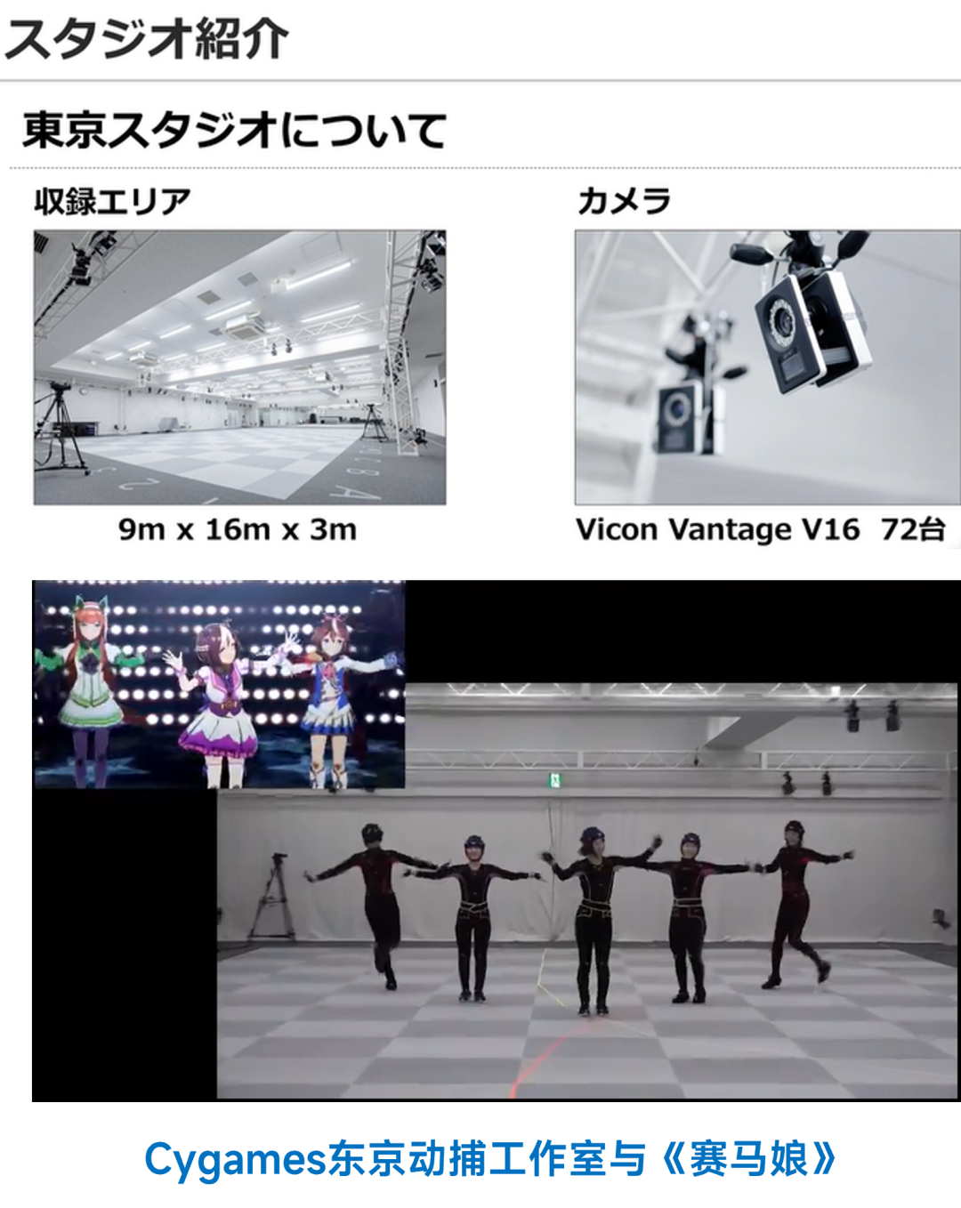 在《赛马娘》游戏动画的制作中,位于东京的动作捕捉工作室使用了72台Vicon Vantage V16设备,通过高精度动作捕捉技术对游戏内获胜、育成等多个动画进行制作。