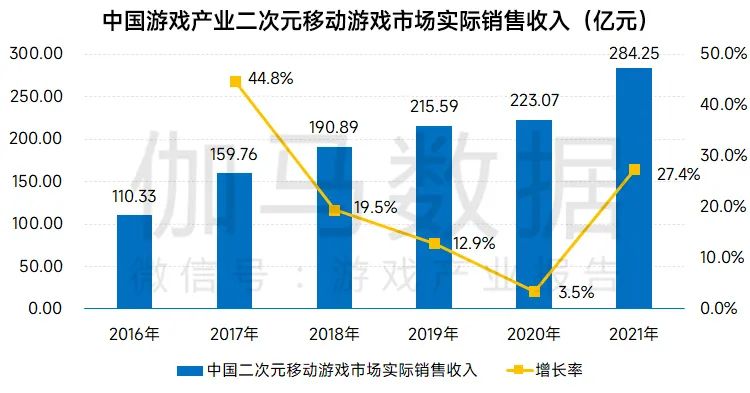 2021年中国移动游戏市场整体增速放缓,同比增长7.57%,但二次元移动游戏一枝独秀,2021年实际销售收入同比增长27.4%,完成了逆势增长。