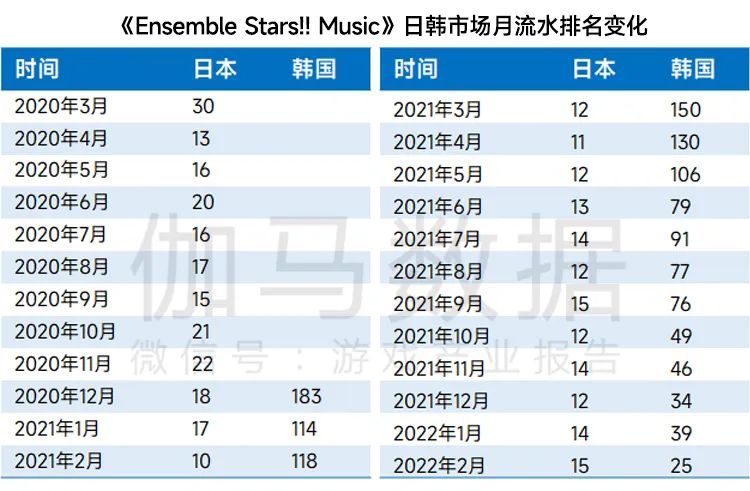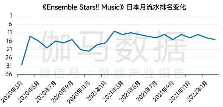 据伽马数据测算,《Ensemble Stars!! Music》进入日本移动游戏市场2021年流水TOP20,流水同比增长超过40%。该IP的代表作品曾首次获得日本地区苹果应用商店畅销榜第一的位置,且形成了IP影响力,2017年其IP相关周边的商品销售额超过了100亿日元,多年成熟发展与IP受众积淀,为后续作品《Ensemble Stars!! Music》的流水持续增长奠定了基础。