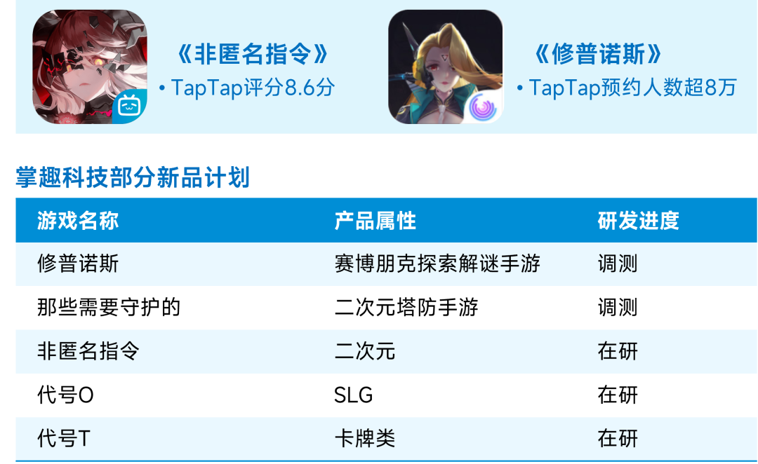 掌趣科技依托在MMORPG、卡牌类等品类中建立的研发优势,在完善既有研发管线保持优势的同时,大力布局新品类游戏的自研开发。公开资料显示,掌趣科技目前新品计划数量众多,包括《非匿名指令》《修普诺斯》《代号O》《那些需要守护的》等,在研游戏品类横跨策略类、二次元等多个游戏品类,部分在研产品已经进入调测阶段。对于新品类游戏产品的研发投入将丰富掌趣科技的产品生态,掌趣科技的游戏研发实力更加全面,面对游戏市场的变化也将具有更强的抗风险能力。