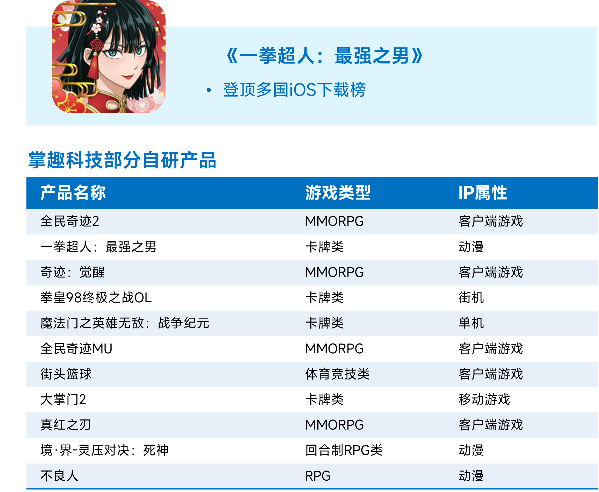 掌趣科技拥有众多不同属性IP游戏的成熟开发经验,这也是在游戏精品化的竞争中掌趣科技核心竞争力的重要组成部分。掌趣科技自研产品品类包括卡牌类、MMORPG、回合制RPG和体育竞技类,游戏IP来源横跨客户端游戏、动漫、单机、街机等多个属性。在游戏研发中,掌趣科技拥有根据IP特点开发IP游戏玩法的能力。IP改编游戏《一拳超人:最强之男》海外版本上线后,陆续在新加坡、马来西亚、泰国、菲律宾、韩国等多国Google Play及iOS下载榜第一。根据伽马数据测算,2021年《一拳超人:最强之男》在海外市场为掌趣科技带来了数千万美元的收入。掌趣科技2021年新游《全民奇迹2》目前已上线港澳台版本,其他版本也在进行上线筹备,制作精良的《全民奇迹2》或将延续掌趣科技游戏出海的优秀成绩。