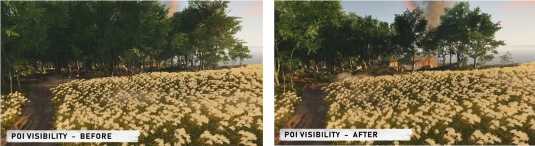 如何让玩家在开放世界中持续保持探索的欲望,是游戏制作中难点之一。《对马岛之魂》的开发商Sucker Punch就这一角度分享了自己的经验。《对马岛之魂》中利用不同地标的设置来为玩家导航,同时根据地标的设置让玩家可以充分探索开放世界地图。在游戏设计中,通过被称为“Weenies”的地标分类法,将地标分为两类:“旗帜”和“面包屑”。“旗帜”是向上延伸的高大地标,如烟雾信号、树木、建筑等,根据不同的优先级在不同距离范围内对玩家可见;“面包屑”是基于地面设置的地标,用于标识游戏内隐藏地点的入口等。随着玩家距离和昼夜变化,地标的粒子效果也会相应做出改变。