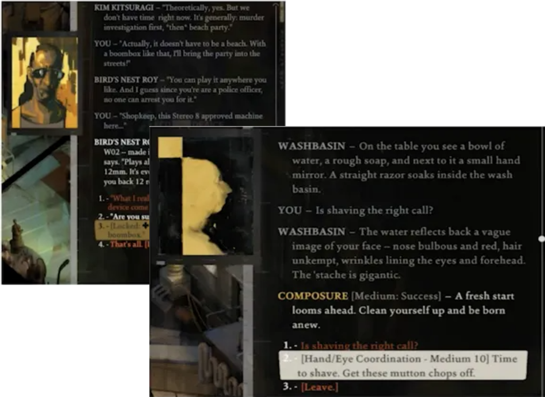 在传统RPG游戏中,NPC的对话往往承载着重要的叙事功能,对话的目的性比较强,玩家更关注的是游戏主要情节相关内容。《极乐迪斯科》的开发商ZA/UM认为,可以让每个角色和互动尽可能有趣和独特,在NPC对话系统的创作中,ZA/UM在对话系统中填充了很多“无意义”内容,这些内容与游戏主要情节无关,例如NPC的生活、个人经历、喜好等等,让NPC更加真实而有分量。此外,ZA/UM还通过“微反应”技术来进一步强化对话系统。“微反应”是指玩家在游戏内微不足道的行为也将被游戏系统所反映。例如玩家在刮去胡子后,游戏每次的对话内容都将因为胡子是否存在而做出不同的改变。ZA/UM认为,虽然“微反应”会提升工作量和开发风险,但当“微反应”发挥作用时,也将带来最真实的RPG游戏体验。