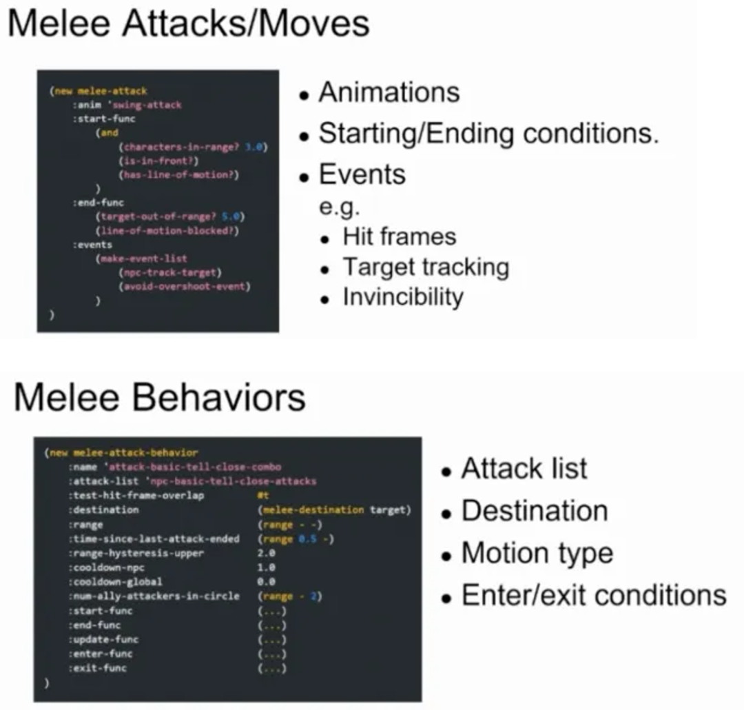 在传统游戏的近战格斗中,敌人的近战攻击时间较短,从攻击开始到攻击生效的间隔也较短,留给玩家的反应时间有限。但在《最后生还者2》中,使用了更长的攻击指令来让玩家识别即将到来的攻击,同时顽皮狗也让敌人的近战攻击更明显,从而能让玩家躲闪开敌人的攻击,并更多地基于技能元素来支撑系统。在程序层面上,顽皮狗首先定义了近战攻击和近战动作背后的数据,例如近战攻击开始和结束的条件,在此基础上,顽皮狗又定义了近战行为,这决定了NPC开始近战后如何与玩家互动。《最后生还者2》的这一做法,让用户认为近战战斗更具战术性。