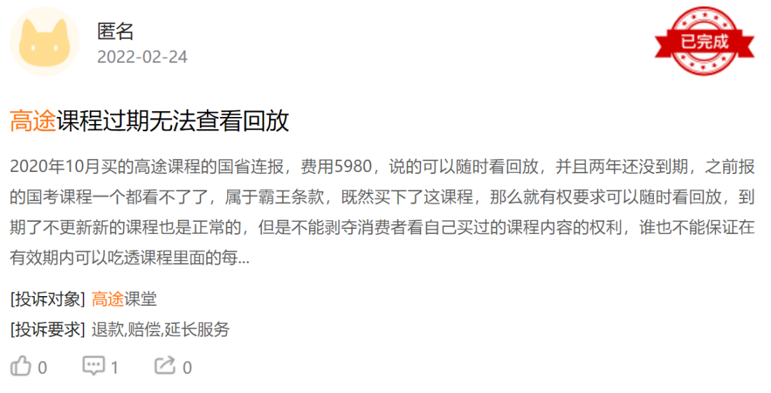 该消费者认为,高途此举属于霸王条款,既然买下了这课程,那么就有权要求可以随时看回放,到期了不更新新的课程也是正常的,但是不能剥夺消费者看自己买过的课程内容的权利。况且也没有给消费者发短信或者微信提示课程到期无法查看,根本不合理,要求恢复原来已购买的课程内容。