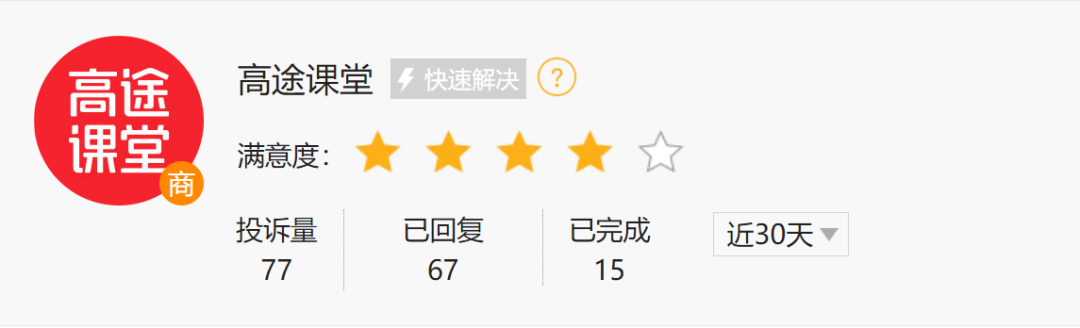 在黑猫投诉平台上,高途课堂近30天内投诉量已达77起。其中,“课程未到有效期就看不了”、“过期后已购买课程也被下架”成为投诉最多的问题。但目前只有15起维权事件显示已完成。