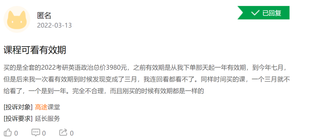 无独有偶,有学员反映以3980元购买2022考研英语政治全套课程,课程有效期为下单日起一年内有效,但后来查看发现课程有效期变为3个月,到期后无法回看。该学员表示“完全不合理”,要求延长服务。