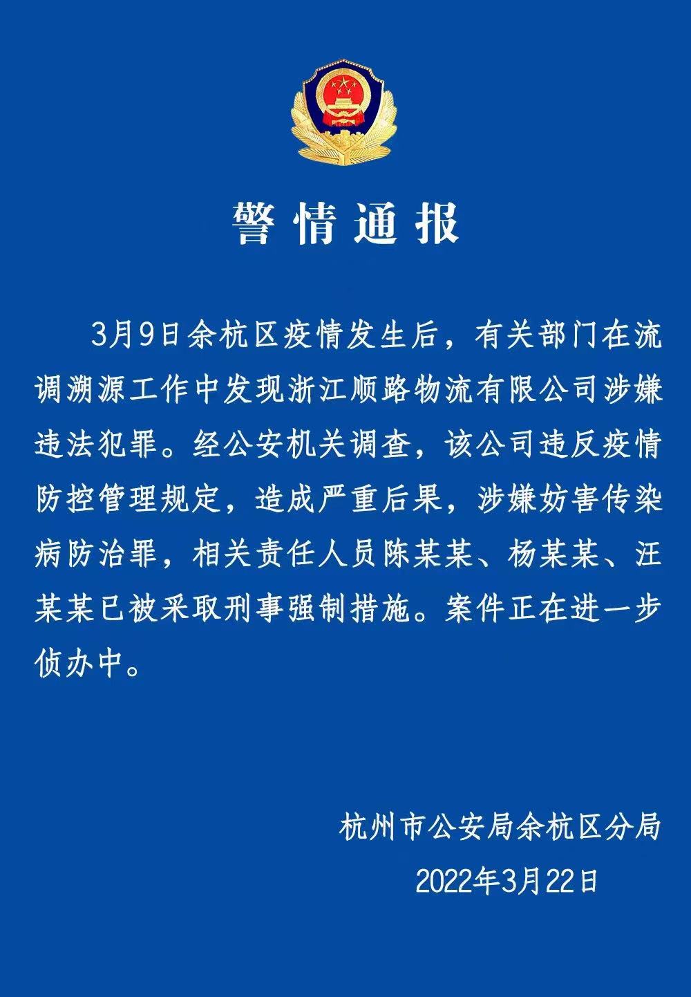 3月22日,杭州市公安局余杭区分局发布了警情通报:3月9日浙江杭州余杭区疫情发生后,有关部门在流调溯源工作中发现浙江顺路物流有限公司涉嫌违法犯罪。经公安机关调查,该公司违反疫情防控管理规定,造成严重后果,涉嫌妨害传染病防治罪,相关责任人员陈某某、杨某某、汪某某已被采取刑事强制措施。案件正在进一步侦办中。