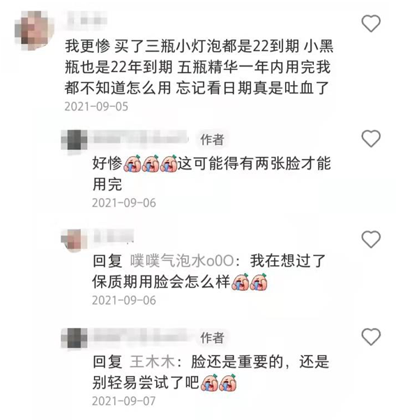 有消费者在网上表达了囤到尾货的心情:“买了三瓶小灯泡都是2022年到期,小黑瓶也是2022年到期,五瓶精华一年内用完,我都不知道怎么用。”“这可能得有两张脸才能用完。”