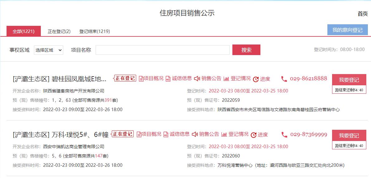 3月23日,界面楼市西安频道从西安市商品住房销售公示平台获悉,万科璞悦项目、碧桂园·云府两个楼盘开始线上意向登记,为期三天。截至中午11时,两个楼盘登记情况均表现良好,后期或摇号销售。