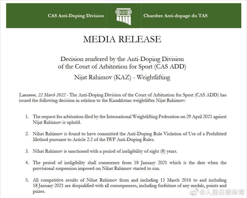 当地时间2022年3月22日,国际体育仲裁法庭宣布,里约奥运会男子举重77公斤级冠军尼德札特·拉希莫夫因服用违禁药物将被禁赛8年,取消他从2016年3月15日到2021年1月18日所有比赛成绩。