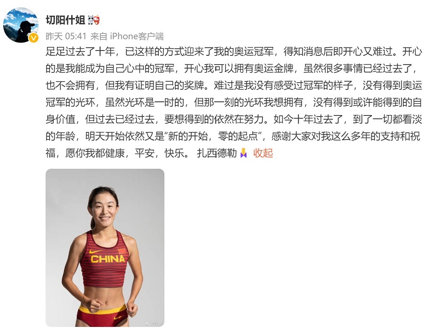 时隔十年终于递补奥运金牌,切阳什姐发微博表示自己“开心又难过”。