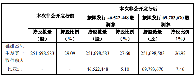 此次非公开发行的发行价格为42.99元/股,对应发行的股票数量不低于4652.24万股且不超过6978.37万股。本次发行完成前,比亚迪与公司不存在关联关系。本次发行完成后,比亚迪持有公司的股份预计超过5%,最高达7.46%。