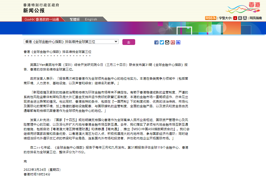 据香港特别行政区政府3月24日新闻公报,英国Z/Yen集团与中国(深圳)综合开发研究院今日(3月24日)联合发布第31期《全球金融中心指数》报告,香港的总排名维持全球第三位。