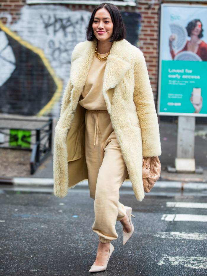 还有一种有趣的搭配是穿上一双高跟鞋。不管是大衣还是夹克,它们和Tracksuit之间的冲突感远不如一双高跟鞋。
