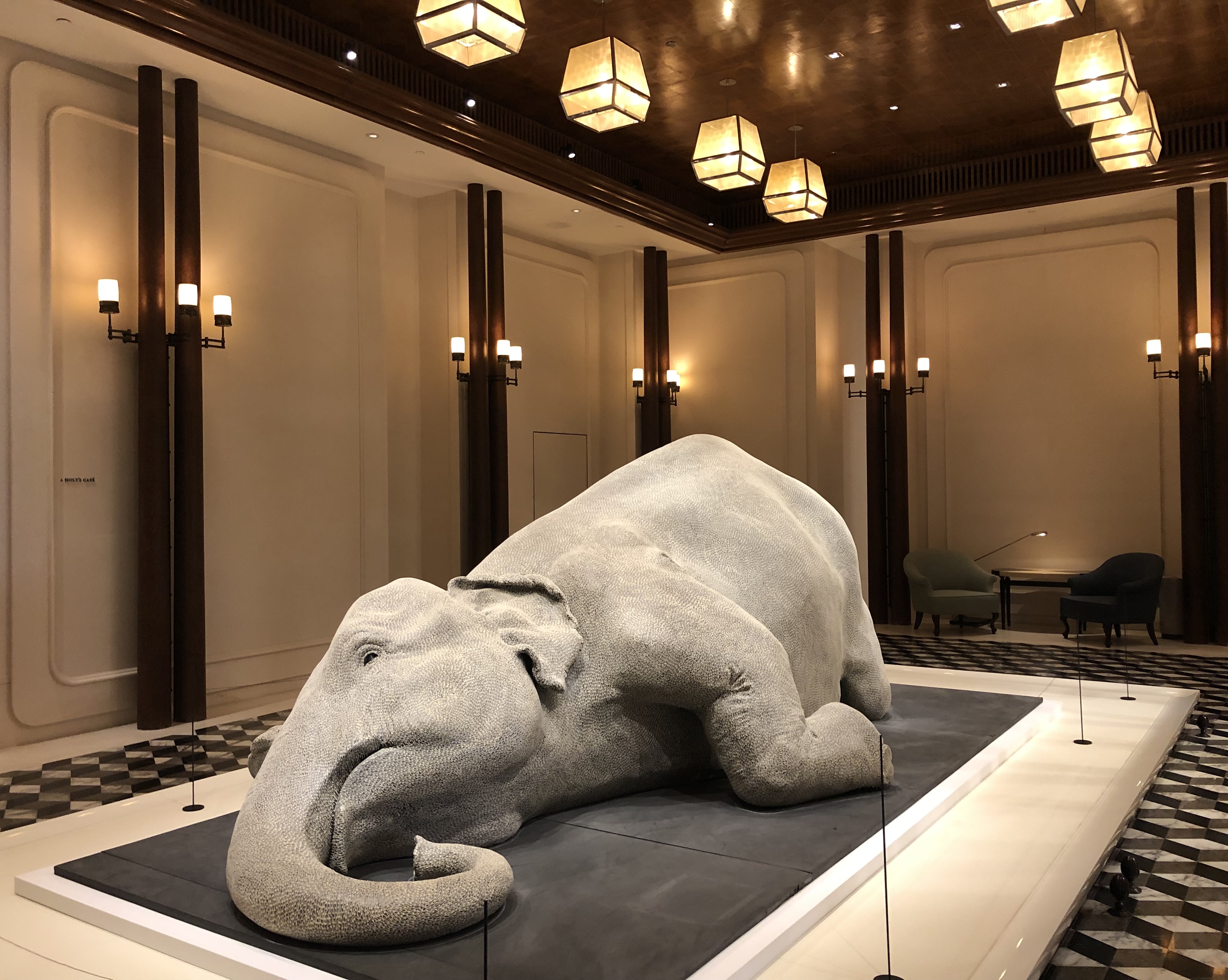 2019年3月17日,施东石依稀记得,那是香港瑰丽酒店的开幕日。受邀观礼的她在抵达那一刻,便被大堂内的一尊大象雕塑所吸引,于是走近,按下快门。对艺术颇感兴趣的施东石赞叹道,这绝对是博物馆典藏级的艺术品。雕塑两侧的花店和甜点铺也令其赏心悦目,温馨的氛围即刻填满。