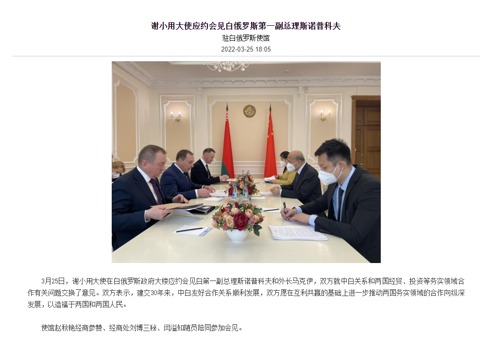 据中国驻白俄罗斯大使馆网站,3月25日,谢小用大使在白俄罗斯政府大楼应约会见白第一副总理斯诺普科夫和外长马克伊,双方就中白关系和两国经贸、投资等务实领域合作有关问题交换了意见。双方表示,建交30年来,中白友好合作关系顺利发展,双方愿在互利共赢的基础上进一步推动两国务实领域的合作向纵深发展,以造福于两国和两国人民。