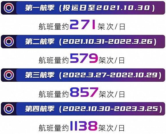 到第四航季(2022年10月30日-2023年3月25日),仅国航、川航、东航、成都航空维持两场运营,其余内地航空公司一次性100%完成转场。