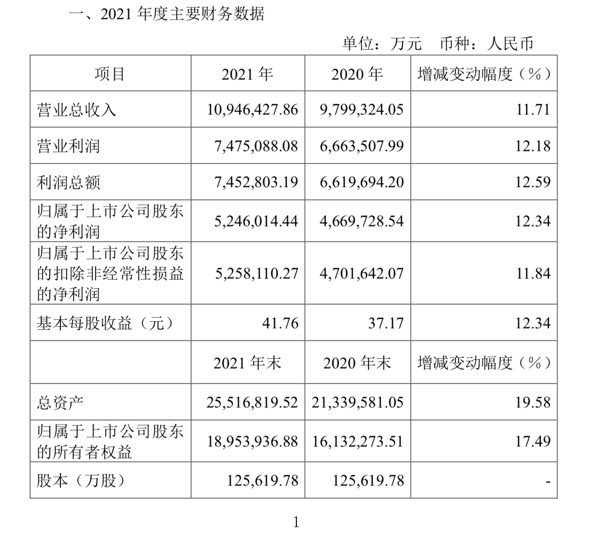 3月28日晚间,贵州茅台酒股份有限公司(以下简称“贵州茅台”)(600519)发布《2021年度主要财务数据及2022年第一季度主要经营情况公告》显示,2021年贵州茅台实现总营业收入1094.64亿元,同比2020年979.93亿元提升11.71%;归属于上市公司股东的净利润为524.6亿元,同比2020年466.97亿元提升12.34%。