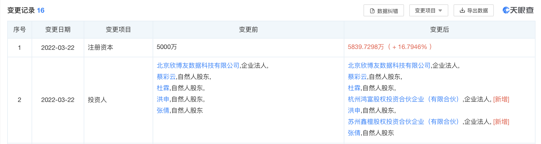 蓝鲸财经注意到,据天眼查数据,倍赛科技主体北京深度搜索科技有限公司新增股东杭州鸿富股权投资合伙企业(有限合伙)(下称 “杭州鸿富”)和苏州鑫檀股权投资合伙企业(有限合伙)(下称 “苏州鑫檀”)。两家新股东背后分别是鼎旭和东方嘉富,系此前宣布的B轮融资方。