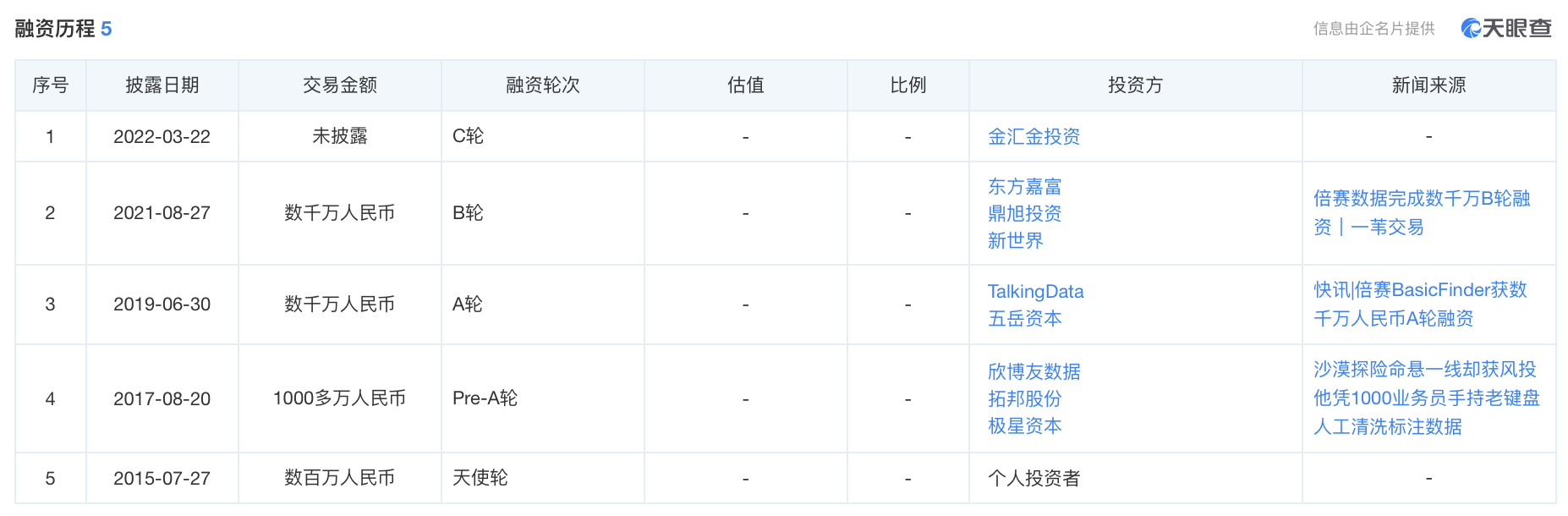 与此同时,据天眼查数据,倍赛科技在近期获新一轮C轮融资,融资方显示为金汇金投资。目前,双方均未曾对外公布过相关融资消息。自2015年成立,倍赛科技过往曾宣布获TalkingData、五岳资本、新世界、拓邦股份(002139)、极星资本和北京欣博友数据科技有限公司(下称 “欣博友科技”)等投资。其中,拓邦股份已从倍赛科技股东名单退出。TalkingData是大数据分析平台,欣博友科技同样涉足数据加工。