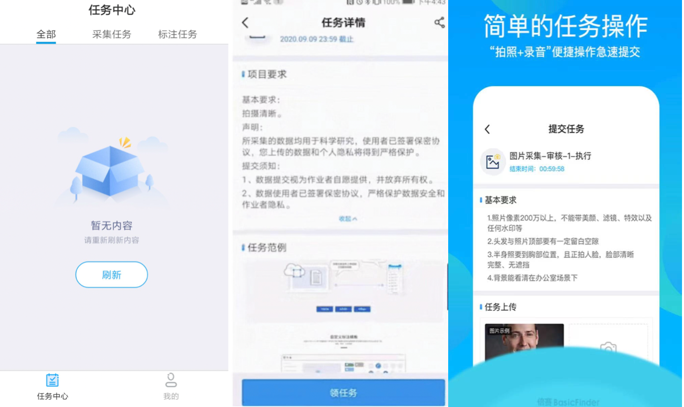 根据倍赛科技的使用教程,此前有项目要求,所采集的数据均用于科学研究,使用者已签署保密协议,用户上传的数据和隐私得到严格保护。在部分软件下载平台的应用介绍页面,样例显示采集任务为“半身照”,并展示任务范例,提示采集数据用于科学研究。