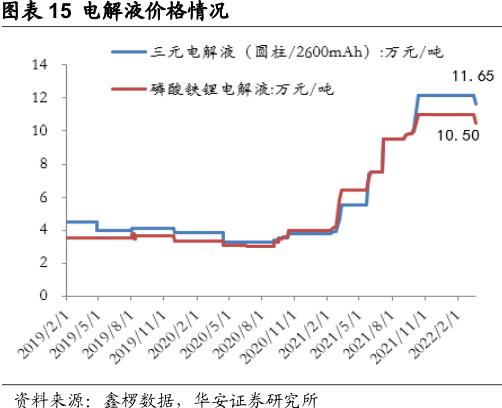 从电解液价格走势也可以看到,受供需关系紧张影响,2021年电解液产品价格飙升,磷酸铁锂电解液由去年年初的4万元/吨逐渐涨至年末的约10.5万元/吨,上涨幅度约163%。