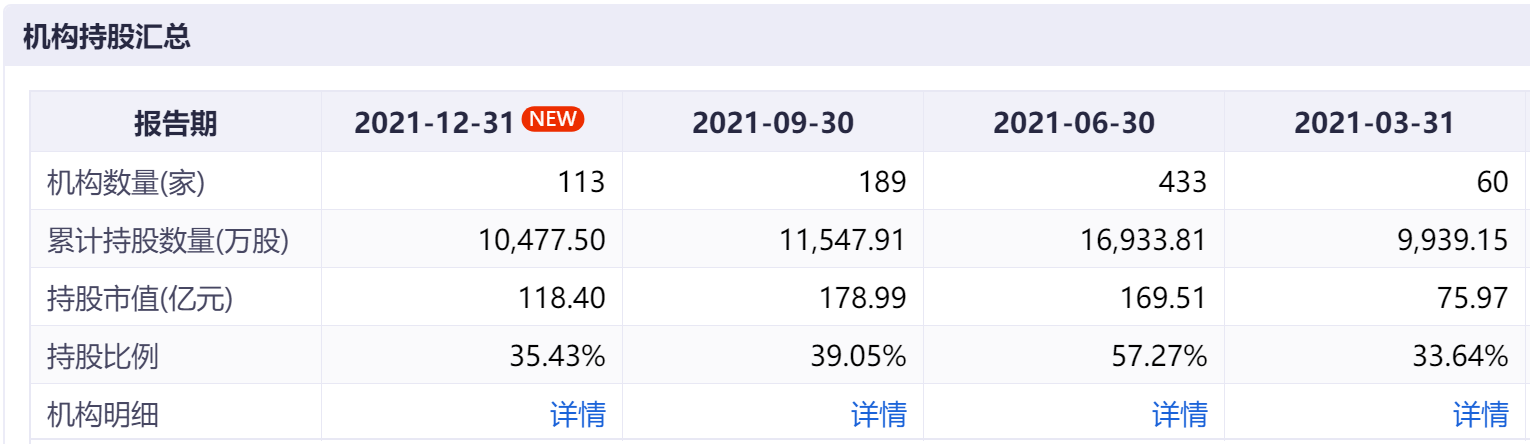 股价表现与机构持股数也较为重合。iFind数据显示,2021年6月末共有433家机构合计持有1.69亿股公司股份,但截至年末,机构数量降至113家,机构累计持股数量也降至1.05亿股,众多机构选择在2021年四季度退出。