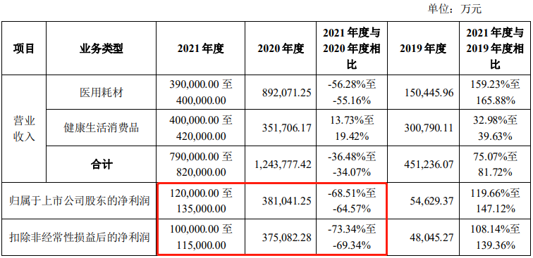 稳健医疗有两大业务板块医用耗材和健康生活消费品,前者主打品牌“稳健医疗”,后者主打品牌“全棉时代”。其中,医用耗材拖了后腿,这一业务2021年营收较上年腰斩,实现了39亿元至40亿元。健康生活消费品营收则同比有所增长,营收反超前者,至40亿元至42亿元。