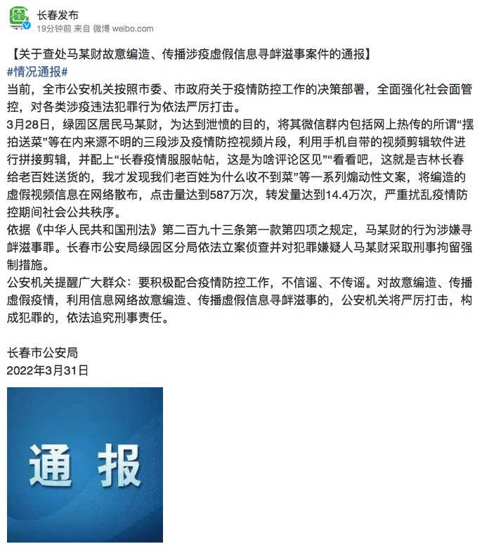据@长春发布 微博消息,长春市公安局31日发布关于查处马某财故意编造、传播涉疫虚假信息寻衅滋事案件的通报如下: