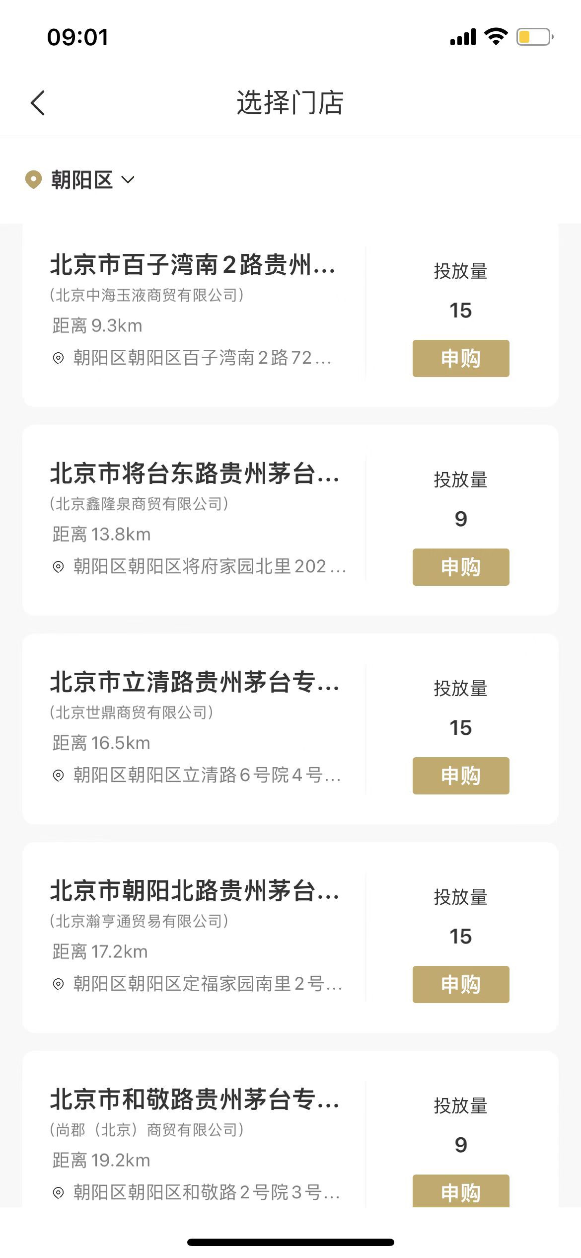 界面记者在申购期间登陆“i茅台”APP发现,在申购前,需先选择所在地区以及线下门店,各个门店显示相对应的供应量。在北京地区包含西城区、东城区、朝阳区、丰台区、海淀区、门头沟区、房山区、顺义区、昌平区、大兴区以及怀柔区共29家线下取货门店,各门店投放量不同,分别在9-15瓶不等,共337瓶。