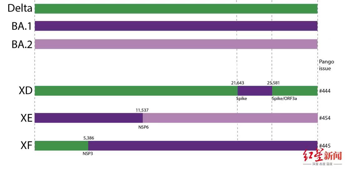 除XE变体之外,英国卫生安全局还在密切关注XF和XD变体。XF和XD变体均是Delta毒株和BA.1的重组体(其中XD是法国Delta与BA.1重组体,XF是英国Delta与BA.1重组体)。
