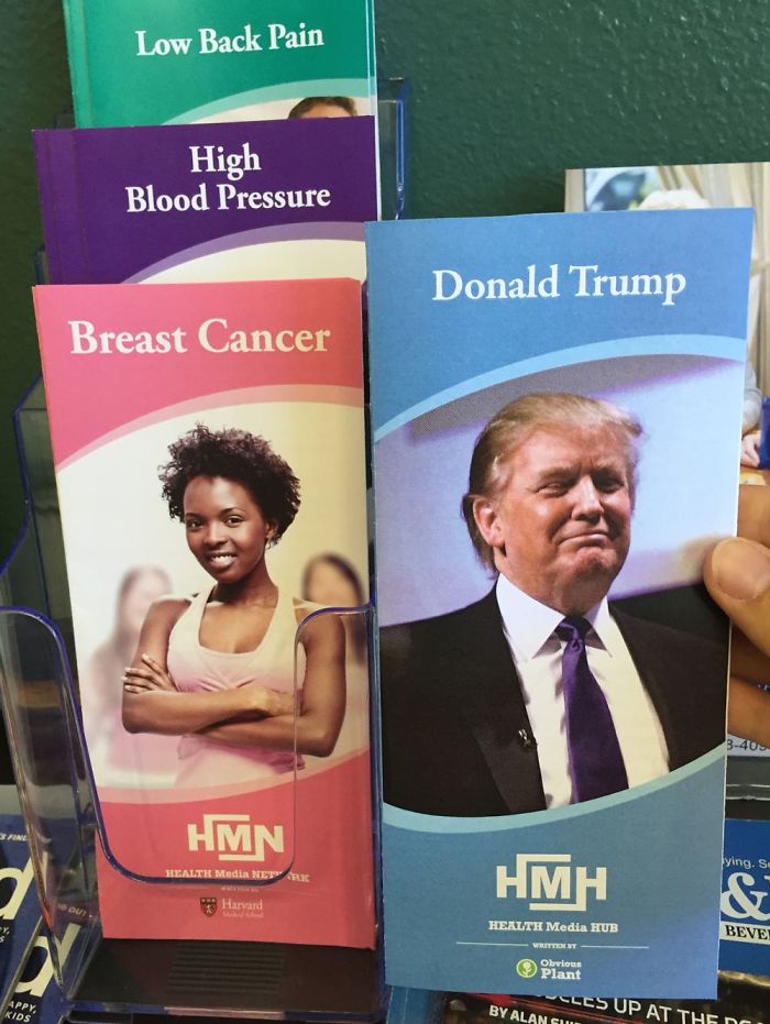 还有,川普气焰正旺的时候,也是他把川普印成了疾病手册,悄悄放在了诊所里的《高血压》和《乳腺癌》旁边。