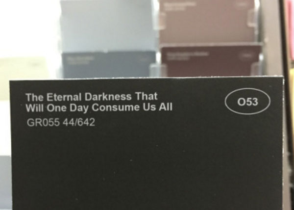 他还乱入过一个卖装修用品的店,把所有的油漆色卡都给重新命名了,放几个你大概感受下...