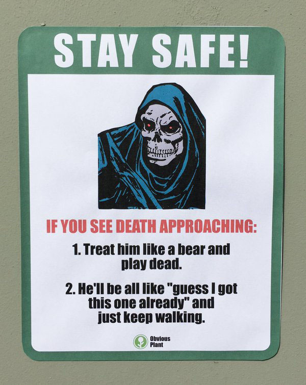 “如果你看见死神走过来:1. 像遇到熊一样赶快装死。2. 死神就会想‘诶这个人我已经搞过了’然后就走了。”
