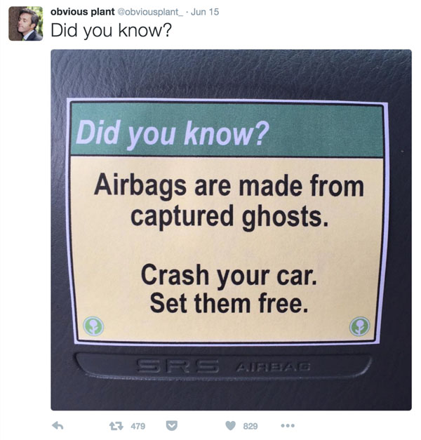 贴在车上的:“你知道吗?安全气囊是用捉来的鬼做的。撞车就能给它们自由。”